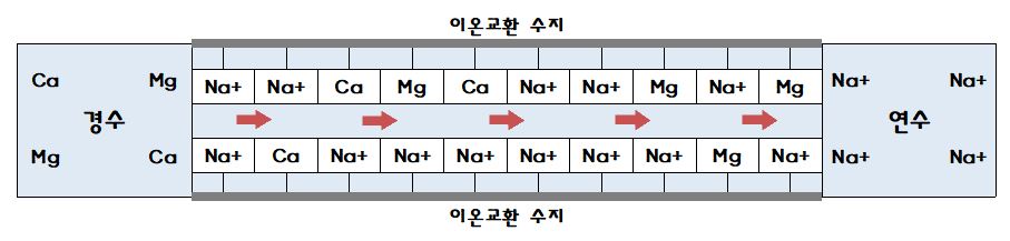 그렇게 되면 양쪽에 Anode과 cathode의 극이 형성되어 용수에 포함된 전기 이온이 제거된다.