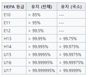 HEPA(High Efficiency Particulate Air) : 0.3 µm 이상의 크기의 (공기를 통하는) 입자 중 99.97%를 제거해야 한다.