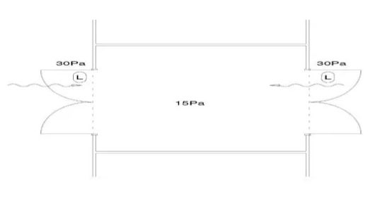 청정도가 높은 구역(45pa)과 낮은 구역(15pa)의 압력차를 만들어 기류를 한 방향으로 흐르게 한다.