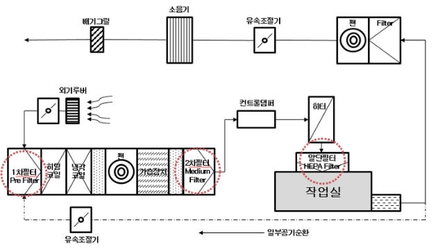 공기조화시스템의 필터는 HEPA를 포함한 Pre필터, medium필터도 존재한다.