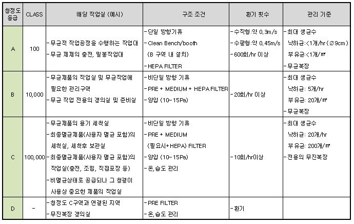 각 공정별 실마다 청정도가 구분되어 있고, 주기적으로 환경모니터링(EM)이 실시된다.